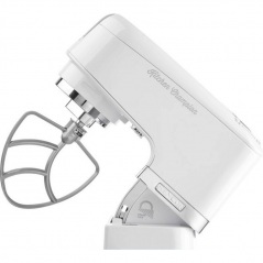 - Urządzenie łączy kilka sprzętów w jednym – umożliwia mieszanie, ubijanie, wyrabianie i miksowanie.