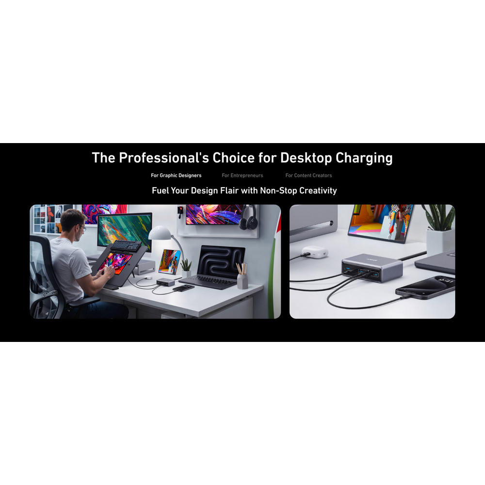 - Ładowarka oferuje 4× USB-C i 2× USB-A do jednoczesnego zasilania wielu urządzeń.