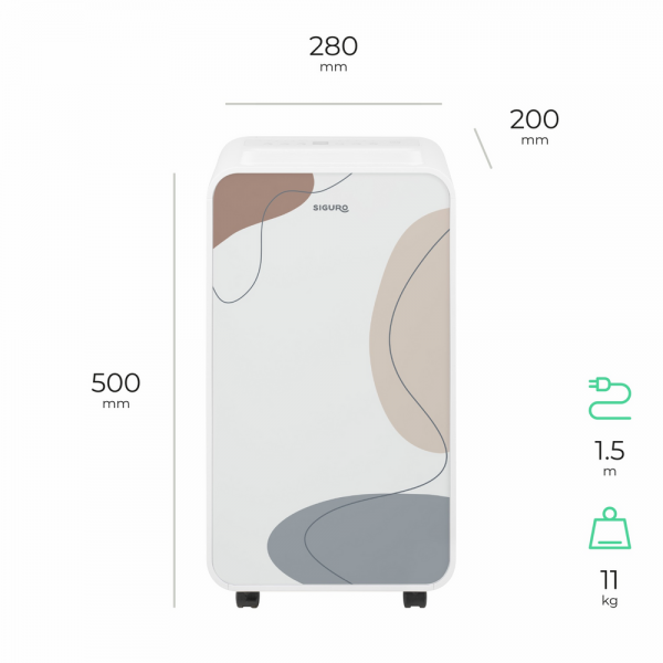 Osuszacz powietrza Siguro DH-C400K Dry Nest o wydajności 16 l/dzień, przeznaczony do pomieszczeń do 20 m². Wyposażony w jonizator, filtr węglowy, poziom hałasu 38 dB, zbiornik 2 l, automatyczne osuszanie, timer, wyświetlacz, wskaźnik pełnego zbiornika oraz możliwość ciągłego odprowadzania wod.