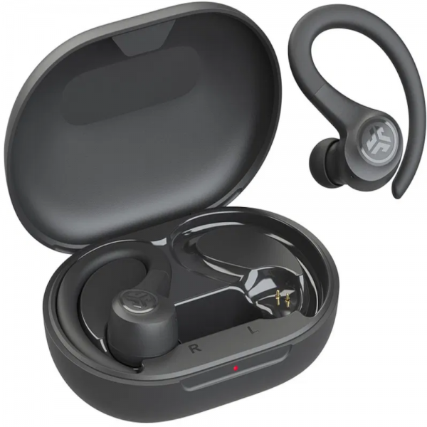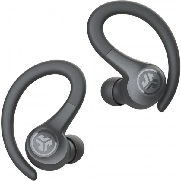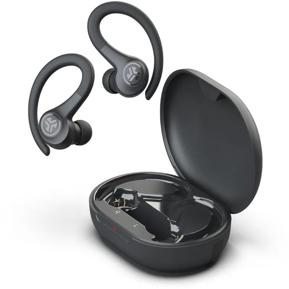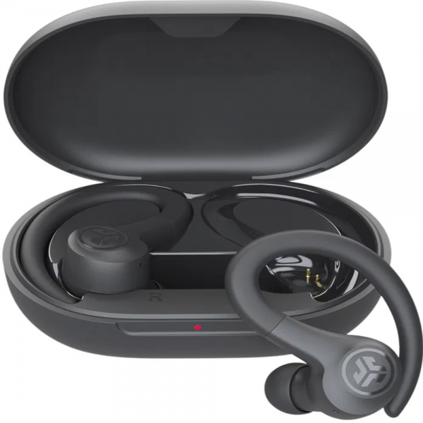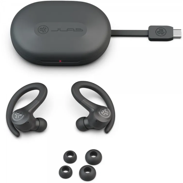 JLab Go Sport+ (Graphite) – bezprzewodowe sportowe słuchawki True Wireless zakładane za ucho z mikrofonem. Bluetooth 5.1, AAC/SBC, sterowanie na słuchawkach, IPX5, czas pracy do 32 h, ładowanie USB-C.