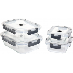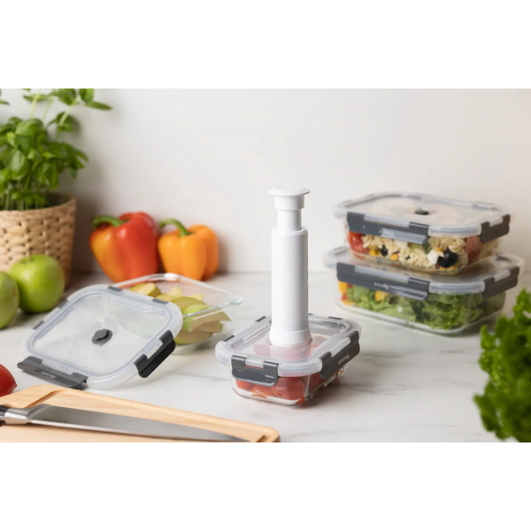 Zestaw szklanych pojemników próżniowych do dłuższego przechowywania żywności. Pompka próżniowa w zestawie. 4 pojemniki z pokrywkami w 4 rozmiarach. Szkło żaroodporne nadaje się również do zapiekania lub mrożenia.