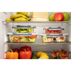 Pojemniki próżniowe wykonane z odpornego szkła borokrzemowego z hermetyczną pokrywką sprawdzą się do przechowywania żywności, zabierania obiadu do pracy czy zapiekania w piekarniku. Szkło borokrzemowe jest wyjątkowo wytrzymałe i wytrzymuje temperatury do 500 °C. W pojemnikach bez pokrywki możesz więc wygodnie zapiekać dowolne potrawy. Wystarczy poczekać, aż jedzenie ostygnie, zatrzasnąć pokrywkę i zabrać posiłek ze sobą do pracy lub w podróż. Plastikowe pokrywki z silikonową uszczelką zatrzaskujesz na pojemniku, całkowicie go uszczelniając. Przez zawór umieszczony na środku pokrywki można odessać nadmiar powietrza, dzięki czemu żywność pozostaje świeża na dłużej. Pojemniki wraz z pokrywkami można umieszczać także w zamrażarce.